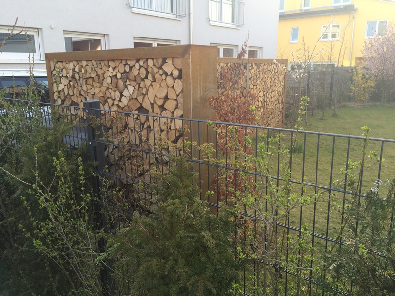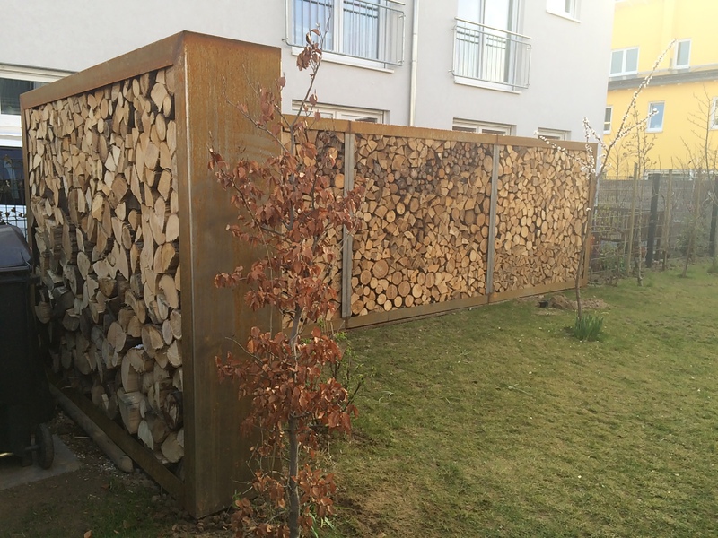 Der Holzunterstand in selbsttragender Eisenkonstruktion wurde auf Kundenmaß angefertigt. Die schwere Konstruktion steht auf Terrassenplatten und im Kiesbett, alternativ ist ein massives Beton-Fundament möglich.
