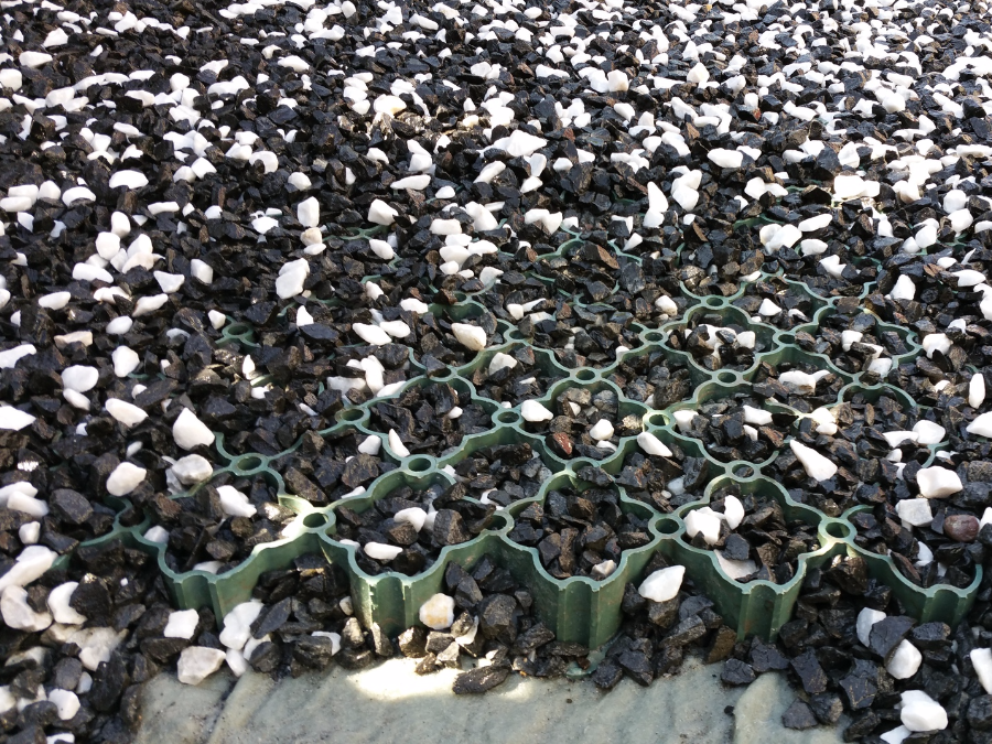 In der vorgefertigten Wabenmatte wird der Kies befestigt, so dass er nicht mehr «wegrutschen» kann. Unansehnliche Spuren, Pfützen und Vertiefungen gehören der Vergangenheit an.